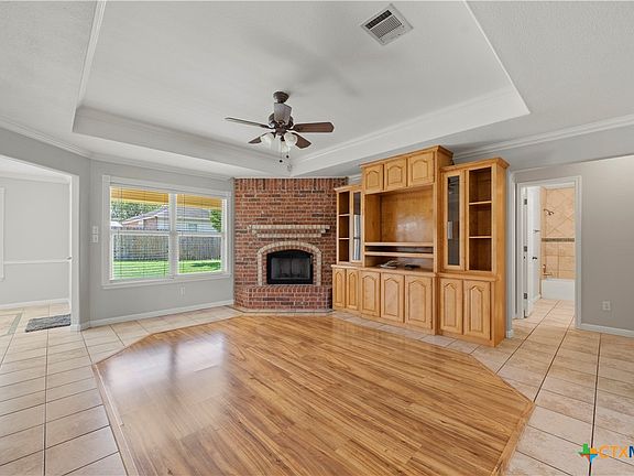 Brick fireplaceSophisticated crown moldingCorner lotDouble-access gatesSpacious covered back patioWraparound brick front porchWinged bedroom layout