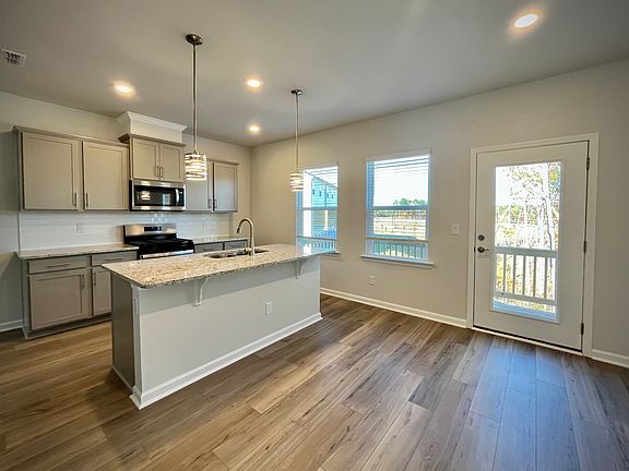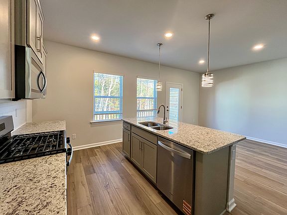 Main floor features a spacious great room with numerous windows, a designer kitchen with extended island, upgraded gray cabinets, beautiful granite countertops, a double-size pantry, and a convenient powder room