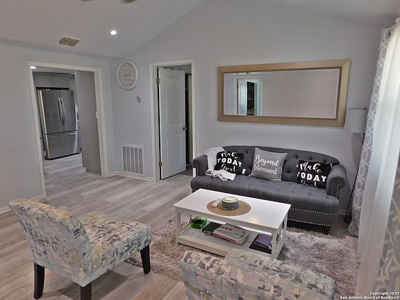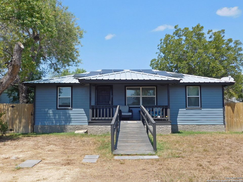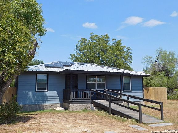 Adorable 3 bedroom 1 bath in the heart of Hondo! Nice home and lot across from park. Many improvements have been made including metal roof, solar panels, privacy fence, siding and paint with trim, double pane windows, new flooring, interior paint, interior doors, lighting, walk in shower with subway tile, large led mirror above new vanity sink, bathroom light is blue tooth, all new custom kitchen cabinets, 2 trash can pull out drawer, stainless appliances, unique mini sink dishwasher and vegetable washer, and much more. Come tour this beautiful home with all of it's improvements!