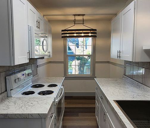 Modern lightingCozy apartmentGorgeous laminate flooringSecured entranceSmall private patio outbackBeautiful countertops and cabinetry