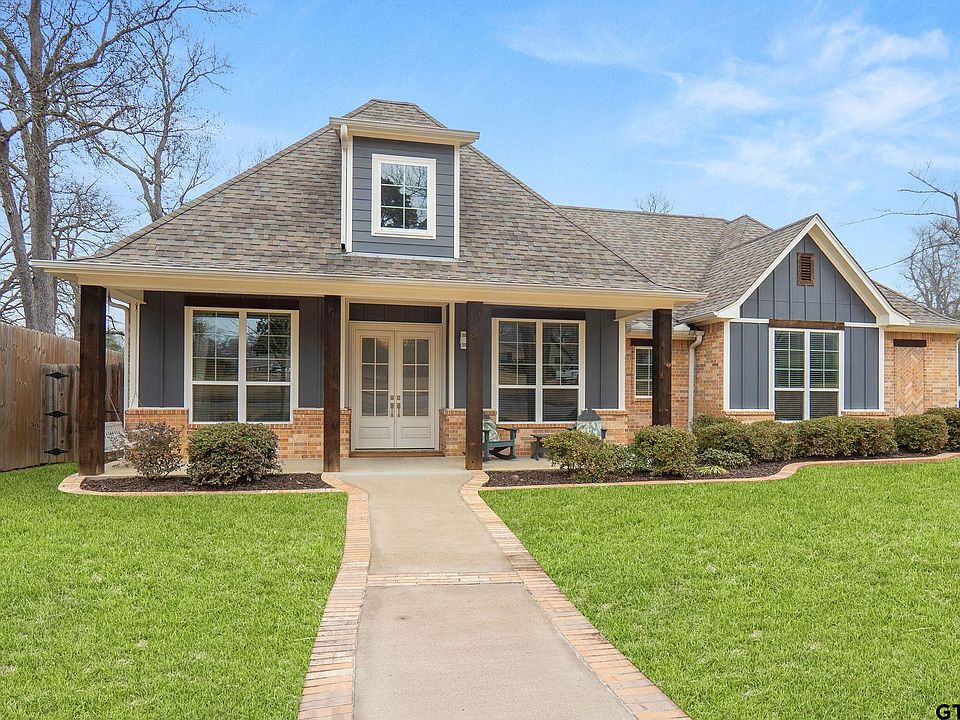 Built in 2017, this exceptional home blends timeless craftsmanship with modern comfort. Featuring custom cabinetry, hand-scraped spruce beams, and soaring ceilings, it offers a warm yet sophisticated ambiance. High-end countertops, 7-foot-tall windows, and luxury vinyl plank flooring throughout the first floor enhance both style and durability, while designer carpet adds comfort to the stairs and upstairs living spaces. Designed with efficiency in mind, the home includes a high-performance HVAC system, a tankless water heater, and a foamed attic for superior energy savings. Additionally, the home is prepped for the installation of a whole home water filtration system, offering added convenience and water quality. With 4 spacious bedrooms, 2 bathrooms, and a versatile upstairs media room or office, this home offers the perfect balance of function and flexibility. The thoughtfully designed split floor plan ensures privacy, with the primary suite set apart from the secondary bedrooms. The primary bathroom boasts a double vanity for added convenience, providing ample space for daily routines. The oversized two-car garage provides ample storage and parking, plus a dedicated RV hookup. Outdoor living is just as impressive, with multiple covered and uncovered patio areas, a full sprinkler system, a privacy fence, and plenty of space for entertaining. Centrally located, this home is just minutes from Tyler’s top dining, shopping, and recreational destinations. Don't miss this rare opportunity to own a beautifully designed home in a prime location!
