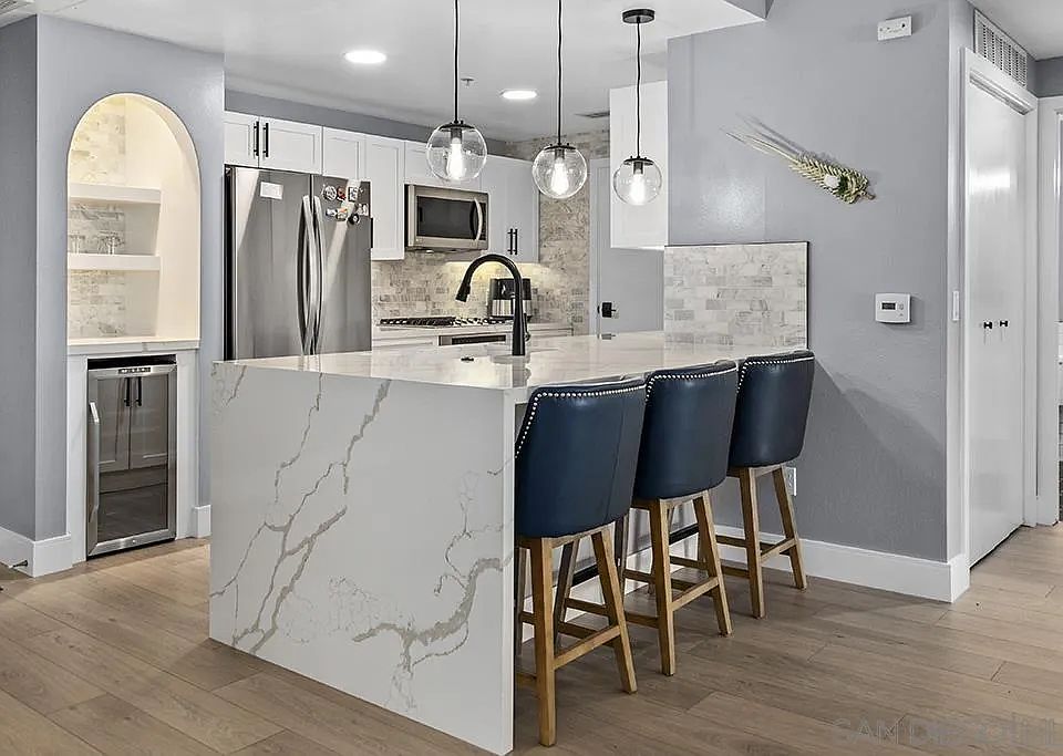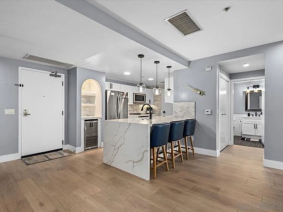 Welcome to Bella Via in the heart of San Diego’s vibrant Little Italy. This spacious 2-bedroom, 2-bathroom condo offers 1,383 square feet of beautifully updated living space, perfectly blending modern comfort with an unbeatable location. The chef’s kitchen features quartz countertops, designer backsplash, stainless steel appliances, and a walk-in pantry. The open floor plan flows into a bright dining area and living room, extending to your private balcony overlooking India Street—perfect for enjoying the energy of the neighborhood below. The primary suite boasts a large walk-in closet and a sleek en-suite bathroom with dual vanities and designer finishes. A second bedroom and full bath provide flexibility for guests or a home office. Wide-plank wood-style flooring runs throughout the home, complemented by in-unit laundry, generous storage, and two side-by-side garage parking spaces. Step outside and you’re surrounded by the very best of Little Italy—award-winning restaurants, coffee shops, boutique shopping, weekly farmer’s markets, and waterfront parks all just steps away. This home combines modern upgrades, convenience, and location—a rare find in one of San Diego’s most sought-after communities.