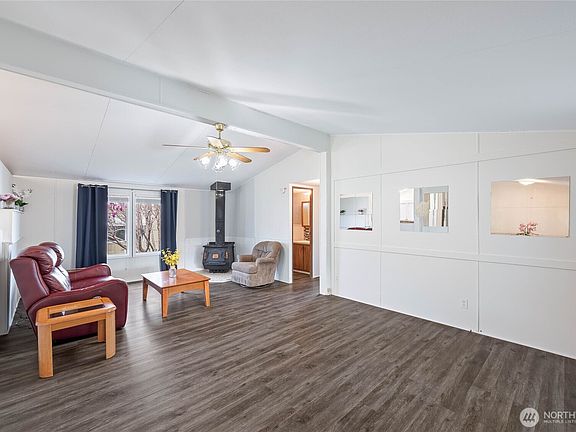 Charming 3 Bed, 2 Bath home in Wenatchee's 55+ Ridgecrest Community! This well-maintained home offers comfortable living in a peaceful setting. The primary bedroom features a walk-in closet and en suite. The additional covered space off the laundry room could be used for extra storage, hobby room, or an indoor garden space. Enjoy relaxing on the large covered deck with mountain views, or cozy up to the wood stove in the living room. Outside you’ll find a carport, additional parking, and a landscaped yard. Monthly $600 rent includes sewer, water, and property management. Newer HVAC with air conditioning to keep you cool. Call today for a tour!