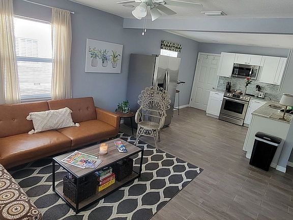 Welcome to your oasis in St. Pete with this furnished 2 bed 1 bath home just a 5 minute drive from downtown. It has been beautifully updated throughout including flooring, cabinetry, appliances and more. The furnishings will make you feel right at home and you'll enjoy all the modern features such as an open concept layout and a kitchen with stainless steel appliances and a dishwasher. The kitchen is well stocked with everything you need to cook and entertain! The backyard is large, fenced in and has more than one lounge area, making it the perfect setting for relaxing, barbecuing or playing with your pup.