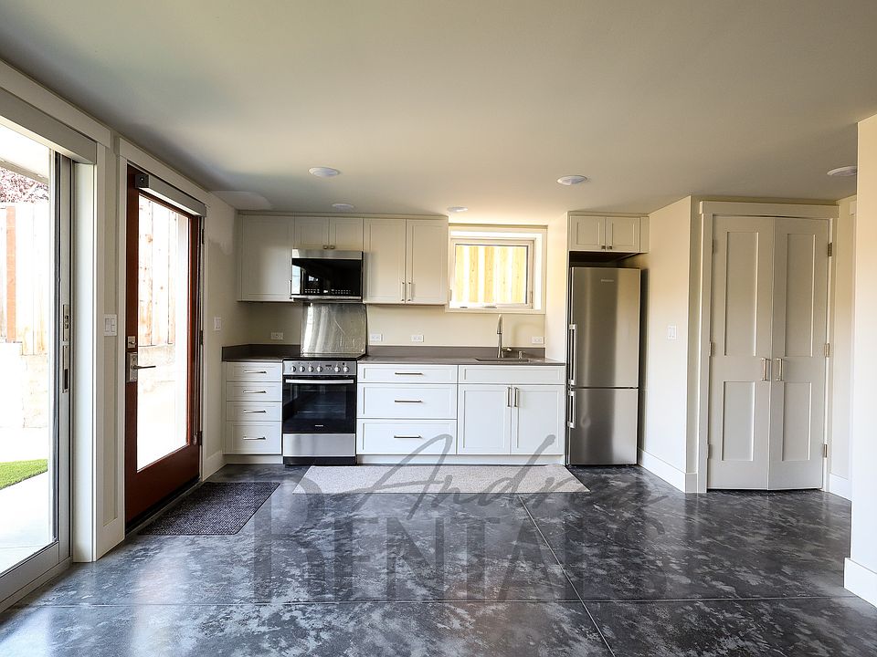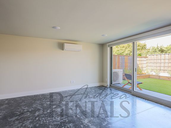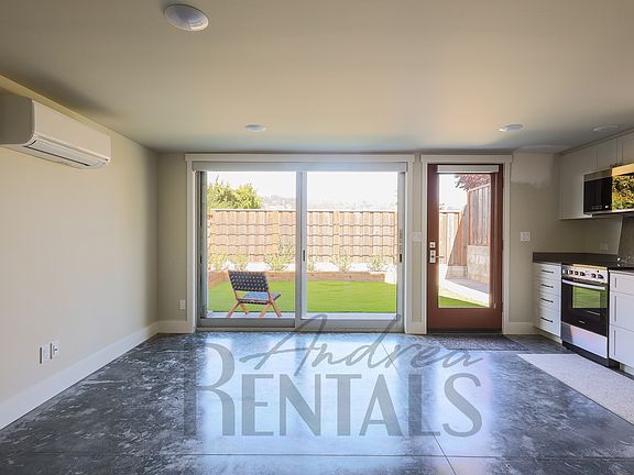 This architecturally designed and rebuilt studio is ready for its first tenants! There is a beautiful kitchen on the left wall with brand new appliances, including a washer and dryer. There is a modern concrete floor, a bathroom with a shower over tub, and the whole unit opens up to a spacious backyard with beautiful views of the hills, perfect for indoor/outdoor living.