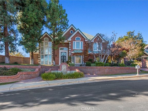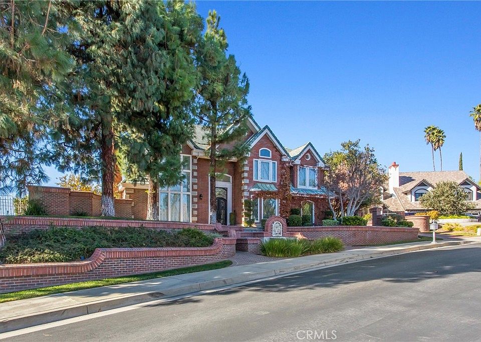 Magnificent home in the exclusive gated community of Smiley Ridge. This beautiful brick residence features classic leaded-glass windows that fill the home with natural light, charming brick planters, a front courtyard fountain, and mature landscaping throughout. Enjoy spectacular panoramic views of San Timoteo Canyon from multiple levels of the home. Inside, the 5-bedroom layout offers excellent flexibility. The main level features wood flooring and two bedrooms, including the primary suite with dual sinks, a separate shower, and a jetted soaking tub. Upstairs are three additional bedrooms plus a spacious family room/loft overlooking the living room below. The bright, functional kitchen includes stainless-steel appliances, a peninsula with a sink, and recessed lighting. A newly remodeled guest house sits above the garage with views of the pool—ideal for guests, multigenerational living, or a private office. The backyard is designed for privacy and enjoyment, bordered by brick walls and wrought-iron fencing.