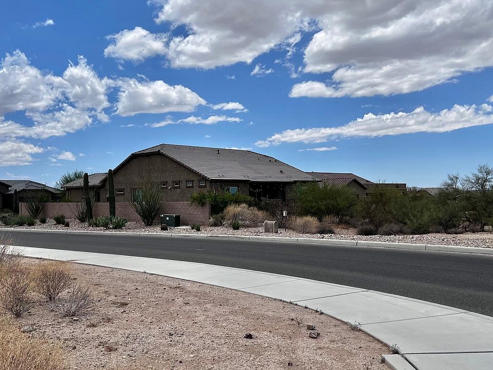 Turn key, corner lot, Lennar's home-Oracle Model. Highly sought after, Next Gen-home within a home (live in one and rent out the other). Main house has 3 bedrooms, 2 bathrooms. Private guest suite~706 sq ft, complete with kitchen, bedroom, bathroom, laundry, yard, private entrance (garage has AC unit). Inside of house you will find wood-look tile gracing the floors, 10' ceilings and on-trend lighting and ceiling fans. Gourmet kitchen has double ovens, a versatile island with breakfast bar, stainless appliances including a gas cooktop, and striking granite counters. Home is backing to open space for privacy, your own resort living, yard features a travertine patio, fire pit, water feature, built-in BBQ, bar with seating, raised garden bed and elegant desert landscaping with mountain view