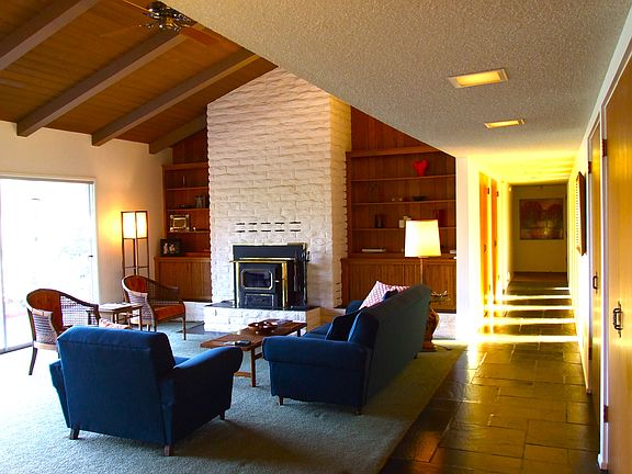 Super Cool Mad Men Hideaway with Pool Table, 2 stone fireplaces, Magnificent Oaks, Hill/Sunset Views, Golf, Casinos, More! Enjoy views of the hills and sunsets from the patios and every room in this super cool mid-century modern Mad Man hideaway. Set on a private oak-covered acre, this single story, 2500 sq. ft. 3 bedroom, 2 bath home features a huge (400 sq. ft.) bonus room with enormous rock fireplace, big screen TV, musical instruments, bar, and pool table. Our Mad Men home is located 18 miles from the coast on the eastern ridge of the oak-covered hills surrounding beautiful Gird Valley east of Fallbrook. A long driveway, lined with towering and magnificent ancient oaks, leads to this secluded estate but it's just a short drive to golf courses around the corner, to restaurants and the nearby casinos. This is a special place and grinding stones found on the property tell us this site was a favorite of the Luiseño tribe, also known as the Payómkawichum, "People of the West." The Entry opens to an over-sized Living Room decorated with special pieces from the 1960s. This is a stunning room, with its adobe fireplace, high vaulted wood ceilings and a full wall of floor-to-ceiling glass offering expansive views of northern hills beyond the rose garden and relaxing patios. The Kitchen was upgraded for today with solid wood cabinets, bright white countertops, a subway tile backsplash and new appliances. The new stainless steel sink features a fun faucet with an LED light inside that glows green for cool water, blue for lukewarm and red for hot. The Kitchen also has a huge Pantry fully equipped with everything you need for entertaining. The Dining Room, with seating for 8-10, has glass doors that lead to the North Patio where an umbrella-topped table with seating for another 6. The six-burner BBQ makes entertaining fun and easy. From the north side of the house, you can watch the rocks turn pink on the hills as the sun sets through the oaks. Read a book, slow down and enjoy the views. Relax. Or play. Head out for golf at the fabulous selection of nearby courses; explore the local theme parks or catch as show at one of the casinos. Southern California has something for everyone! The Master Suite features an extra firm King bed and floor-to-ceiling glass sliding doors with views of the rose garden and hills to the north. The Master Bath has a large shower and tub plus separate vanity and makeup areas. Bedroom #2 has a King bed with sliding glass doors opening to the rose garden and northern views. Bath #2 is nearby in the hall and has a shower and long large vanity area. Bedroom #3 has a Queen-sized sofa bed and glass doors to the South Patio with seating for four. From this room and patio you can watch the sun set over the hills to the west. At the eastern end of the house is a 400 sq. ft. Rec Room with an enormous rock fireplace, parquet floors, soaring ceilings, a big screen TV, musical instruments, bar, and pool table. Glass sliders at each end of this huge room let you enjoy the weather while providing views to the north and access to the South Patio. The neighborhood is excellent for walking, with both flat areas and challenging hills and there are lovely trails to explore in Fallbrook. Local wildlife includes hawks and owls, coyotes and quail, road runners, frogs, rabbits and more. Fallbrook's weather is among the finest on the planet -- at any time of the year. While San Diego averages 146 sunny days each year Fallbrook averages 264. So this really is the place to be! Keywords: MCM, mid-century modern, Mad Men, golf, northern views, western views, North San Diego County single story home, pool table, garden, oak trees. You'll love this spot in summer or winter. Average temperature in the 70s all year. SEE MORE AT "VACATION RENTALS BY OWNER" PROPERTY #552989.