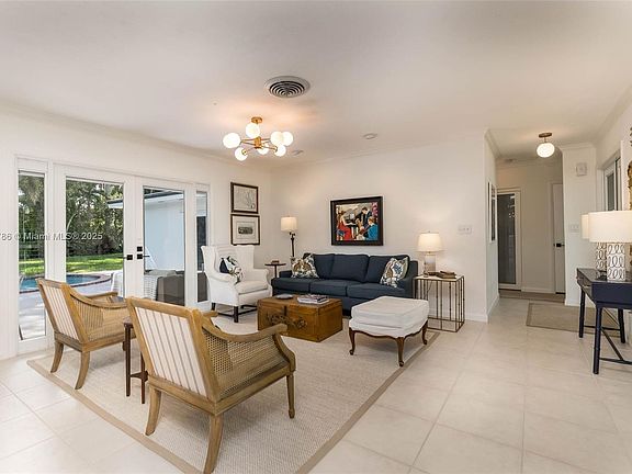 Gorgeous 4 bdrm, 2 bath home on a spectacular oversized lot in Palmetto Bay. Newly painted exterior. New metal roof installed: 2023. Impact windows. Sun-filled formal living & dining rms w/ gorgeous floor to ceiling windows, plantation shutters & neutral tile floors. Open kitchen features oversized island w/ seating, double ovens, gas stove & sliding corner windows w/ adjacent family rm complete w/ cozy bookshelves. Primary suite overlooks the lovely backyard, has walk-in closet & bath w/ glass enclosed shower, jetted tub, double sinks. Lush, private backyard w/ mature trees, fully fenced w/ double gate; plenty of space to park your boat or build a pickle ball court! Plus pool, covered patio. 2 car garage.