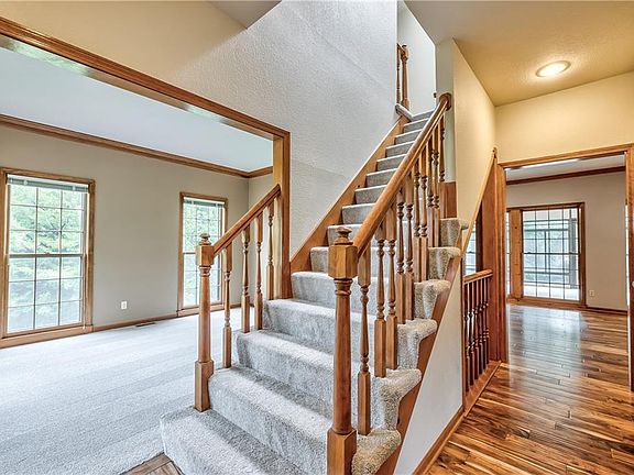 Welcome to this custom Colonial home nestled on nearly 5 acres of pure serenity. Open concept kitchen, adorned with gorgeous Acacia hardwood floors which seamlessly flow into the breakfast area and family room. Natural light streams through the wall of windows. Enjoy the cozy wood-burning fireplace. The kitchen boasts granite counters, stainless steel appliances, and a pantry. Entertain family and friends effortlessly in the dual sun rooms, deck, and stamped concrete patio. Working from home is a breeze with high-speed internet and dedicated office space, complete with elegant French doors. This home includes the following updates: remodeled master and basement bathrooms, a newer deck, and fresh interior above ground carpet. Spacious master bedroom featuring a large walk-in with a custom closet system. Master bath exudes relaxation with its luxury vinyl plank flooring, whirlpool tub, onyx shower, and dual vanities. Second bedroom, with French doors leading to the master bedroom, is perfect for a nursery or office, complete with walk-in closet. Bedroom 4 offers soaring ceilings and loft area. The walkout basement is an entertainer's paradise, offering a sprawling rec room with wet bar area, granite counters, reclaimed barn wood accent wall, and a full bath. Recent updates include new HVAC system and water heater, while the roof is just seven years young. Experience the beauty of nature from your backyard oasis with the fenced yard adorned with mature trees, a koi pond, and recently landscaped areas. A paver patio beckons the creation of a future fire pit. Animal lovers will delight in frequent sightings of barred owls, deer, and wild turkeys, while exploring the wooded trails. Huge shed with a concrete floor. The fenced area encompasses approximately 2 acres, with the rear portion featuring woods and a small stream during heavy rains. Don't miss the opportunity to make this home your own private retreat, offering the perfect blend of tranquility and modern comfort.