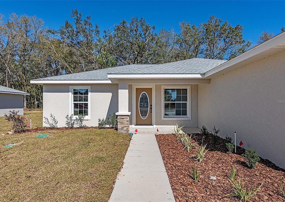 Construction complete! Welcome home, brand-new construction waiting for you. Located in the family-friendly neighborhood of Orange Blossom Hills, this three-bedroom, two-bath home is modernly designed with countless luxurious finishes. Cathedral ceilings featured with an open floor plan — light and bright! The beautiful chef's kitchen is fully equipped with stainless steel appliances, granite countertops, upgraded shaker cabinets, a large cooking space for a large sink and bar seating and a pantry. A flex space at the back of the kitchen to utilize as an office space/playroom with views of the spotless living room and dining room. The impeccable split floor plan provides the perfect mix of space and privacy. Extras include tray/vaulted ceilings, tile/carpet flooring throughout, a whole-house security system, an irrigation system, two-car garage, inside utility room and covered back patio. The spacious master suite features a tray ceiling, a walk-in closet and the master en suite with dual sinks, granite countertop, shaker cabinetry and a seamless glass-enclosed walk-in shower. The spare bedrooms are spacious with a shared hall/guest bath and linen closet. All of this is located within minutes of The Villages and its world-class entertainment and dining options, along with grocery stores and shopping and minutes to the Florida Turnpike. CO ISSUED 4/28/2023