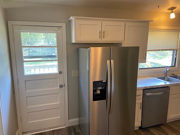 Home is split level with 3 bedrooms upstairs with full bath, living room, dining room, and kitchen. Master bedroom has small deck and master bath. Kitchen has walk out to deck with stairs going down to patio area and large fenced back yard. Kitchen has newer stainless steel appliances, laminate flooring, cabinet doors and countertops. There are 2 hall closets and a laundry chute to lower level laundry room.