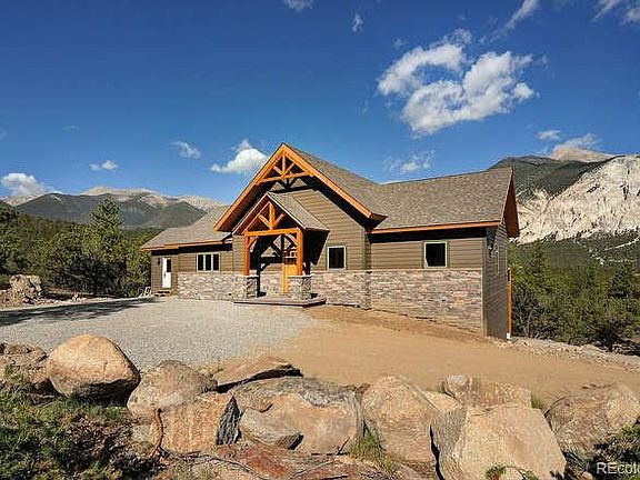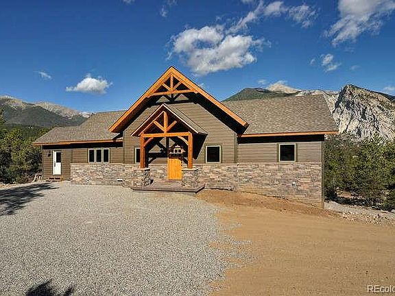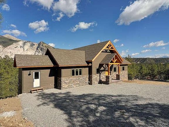 Gorgeous new custom built "Timber Frame" mountain home tucked away on a heavily treed 4.5 acres. This home boasts beautiful timber frame trusses, vaulted ceilings and huge picture windows with views of the Chalk Cliffs and Mt. Princeton. The massive picture windows have stunning views directly facing the Chalk Cliffs which brings in lots of light as it changes across the mountains throughout the day. The high ceilings with exposed beams are complimented by the floor to ceiling beautiful rock fireplace in the living room. This mountain home boasts an open floor plan in the living space which is perfect for entertaining. The Master suite is located on the main floor with master bath and walk in closet. Two additional bedrooms each offer their own bathrooms. This fine home builder provides high end quality construction featuring custom tongue and groove ceilings throughout, beautiful hardwood floors, high end kitchen with stainless appliances and a gorgeous walk out deck off the living space that takes in the gorgeous views. The bathrooms are absolutely stunning with rock walls, beautiful cabinets, and tiled showers and tiled floors. The exterior of this custom home is attractive and features smart siding wrapped with rock and stone. The exterior living space can be accessed off the living space as well as the Master Suite and includes a wrap around deck to sit outside while enjoying the quiet peaceful seclusion. This beautifully treed property with the majestic views of Mt. Princeton and the Chalk Cliffs makes this exquisite fine Timber-Frame home truly a special gem tucked away in the mountains. Construction of this custom fine home slated for completion by July 2020. Offered by appointment.