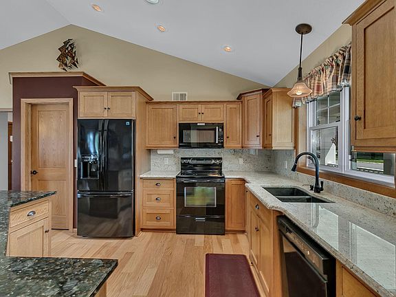 Finally, a turn-key home on a beautiful and private city lot. You will love the open floorplan and walk-out lower level. Entertain from your gorgeous and spacious kitchen...featuring a large center island, pantry and granite tops! This thoughtful home was built with aging in place amenities...no external stairs to the house. Downsizing? Well, compare this one to the prices of the new construction Patio homes. You will love the main floor primary suite with large bathroom and walk-in closet! Relax by the fireplace. The second main floor bedroom would make a perfect work from home office too! The main floor laundry is also a big plus. Step downstairs to your spacious walk-out lower level with a second fireplace, two more bedrooms and huge recreation room. This home has been meticulously maintained and updated over the years. All new flooring throughout, new AC in 2023, granite tops added and so much more. The 2-car garage is oversized with a 30' depth for all the toys. The backyard is very private, and the lot is nearly a 1/2 acre! You're going to feel right at home here!