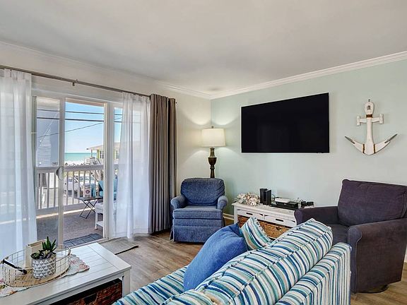 This recently remodeled 2 bedroom, 2 bath townhome is located conveniently across the street from the beach! Interior features include a full-sized kitchen, new floors and furniture, laundry closet, and a primary suite with a beautiful walk-in closet. After a long day at the beach, relax and unwind on the cozy deck and enjoy watching the sunset.