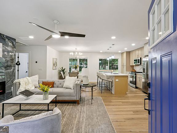 Light & Bright Renovation with a Contemporary Flair! Sun-filled, open floor plan with an inviting living room featuring a dramatic tiled accent wall with an electric fireplace. It's the perfect focal point for cozy evenings or entertaining guests. Flow seamlessly into the spacious dining area and chef's kitchen, where custom cabinetry, quartz countertops, designer lighting, and stainless steel appliances make every meal a delight. The primary suite is a true retreat, offering a spa-inspired en suite bath with a double vanity and an oversized walk-in shower with rain shower head and body sprayers. Two additional bedrooms and a sleek hall bath provide plenty of space for family or guests. Enjoy the thoughtful touches throughout, including a dedicated laundry nook with premium washer and dryer, stylish fixtures, and luxury flooring. Large windows and sliding glass doors invite you to the private backyard - perfect for outdoor dining, gardening, or relaxing under the trees. Located just minutes from downtown Decatur, East Lake Golf Club, and easy access to I-285 and I-20, this home puts you close to the best of Atlanta's dining, shopping, and entertainment.