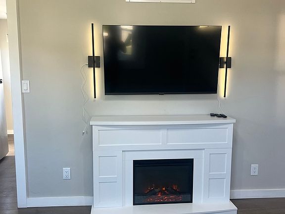 Electric fireplaceKitchen with white cabinetsAll stainless appliancesQuartz countersTrim and light fixtures