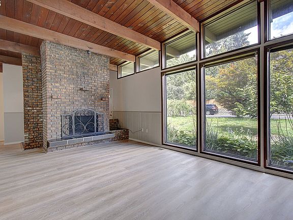 Striking brick fireplaceExposed beamsSingle-level livingFunctional layoutVaulted ceilings