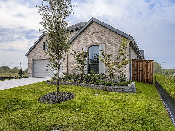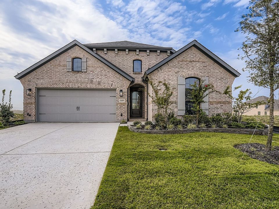 This one-story, four-bedroom, three bath home makes entertaining easy with its open floorplan. Upon entering, you'll feel the openness with a dramatic 14-foot ceiling in the family room along with a beautiful focal point fireplace centered between two large windows. The kitchen is spacious with numerous cabinets, white cabinets, island with quartz countertops and a pantry with great storage. Two bedrooms are at the front of the home with a shared bath. There is another bedroom and bath located separately. The main bedroom is situated at the back of the home and features beautiful floor to ceiling windows while the main bath features an extensive quartz countertop with dual sinks. The closet is amazing with seasonal rods. The home has light colored wood flooring throughout all the walkways, halls, family room, kitchen and dining. Exterior selections include brick with buff mortar, gray trim, black shingles on roof and gorgeous black windows. You can also enjoy the covered patio for entertaining guests in the backyard. Come see this one-story beauty with all that it has to offer. Homesite is near the new amenity center and new phase 3 pool!