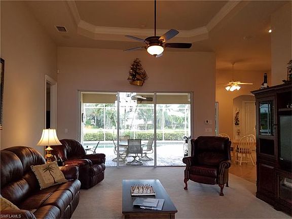 One Owner, Immaculate Waterfront Home in the Intimate, Gated 49 Home-site Enclave of Veridian. Great Access to Sanibel, Ft. Myers Beach. 4 Bed , 3.5 Bath + Den. Soaring Thirteen foot ceilings With Crown Molding in the Great Room Dining and Master Bedroom. Interior Doors are 8 Foot Solid Core with Six Raised Panels. Beautiful, Large Kitchen Boasts 42 Inch Cabinets, Island with Built In Wine Rack, Granite Counters, Tumbled Travertine Back-Splash, Walk-In Pantry with Accent Lighting Above & Below the Cabinets. Stainless Steel Appliances Compliment the Room making it a Dream Kitchen. Large 18 Inch Tile Runs Through the Kitchen, Breakfast Nook, Pool Bath, Half Bath and Separate Laundry Room with Utility Sink. Formal Dining Room Has Solid Wood Floors. Great Room, Den and All Bedrooms Feature Carpet. Plantation Shutters Cover Windows in the Master Bedroom, Den and Formal Dining Room. Every Room Features a Ceiling Fan With Lighting. Lanai Overlooks the Sparkling, Heated Salt Water Pool With Spill Spa Controlled By a Jandy System from Inside. Three Car Garage. Private Well for Irrigation. Whole Home Water Filter. Outdoor Landscaping Lighting. Very Well Cared for Move in Ready Home