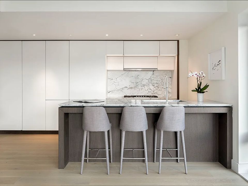 The exquisite bathrooms feature Driftwood Grey marble floors paired with Bianco Dolomite marble walls and a matt white lacquer vanity with stained oak veneer. Additional features include an Undermount Duravit sink with Watermark faucet in pewter finish, a spacious shower with Thermostatic fixtures and Duravit bathtub and toilet. Additionally, the master bathroom has radiant heat flooring. Apartment is equipped with quiet, two zone central heating/cooling and wired for Verizon Fios.