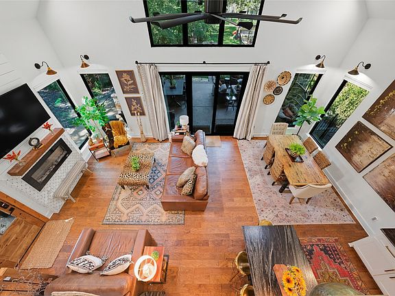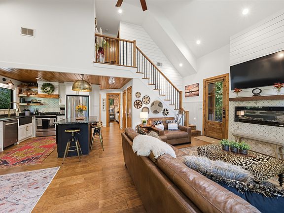 Upscale lakeside cottage featuring soaring ceilings, wood floors, and a wall of windows framing the water views. The beautiful kitchen offers leather granite counters, decorative tile back splash, farmhouse sink, island eating bar, wood ceilings, and a walk-in pantry. The first-level primary suite includes a cozy fireplace and luxury walk-in shower. Upstairs, two guest bedrooms showcase vaulted wood ceilings and share a stylish bath. Enjoy outdoor living with a covered porch accented by wood ceilings, a stone fireplace, and sweeping lake views. Additional amenities include a stone fire pit, fishing and sun pier with lift for personal watercraft, double carport, and a storage building. Beautifully decorated, furnished and move-in ready.