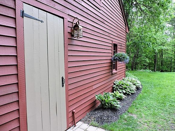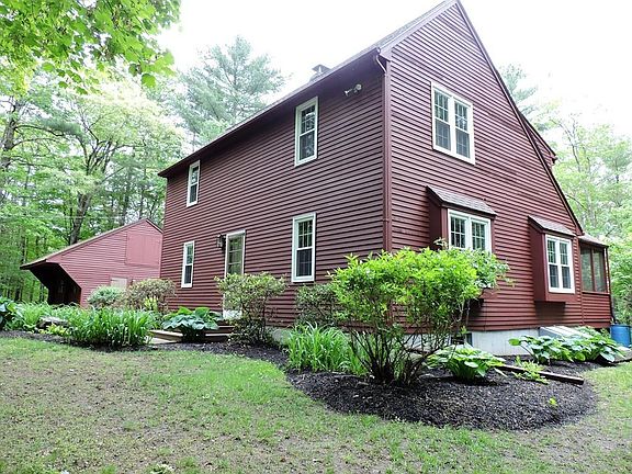 Absolute privacy! Set back off the road this well maintained colonial is set on a tranquil 7 acres. Surrounded by wooded acres and perennial gardens you will find a peaceful retreat in the three season sun room w/ french doors, sky light and exterior access. Kitchen has granite counters, stainless steel appliances and opens into formal dining room. Large living room has fireplace with woodburning stove. Large pine board floors throughout the home brings character to each room as well as the beamed ceilings and window seats in the dining and living rooms. Large master has 3 closets and a private sitting room. The two additional bedrooms are large as well. Finished bonus room in the basement has pellet stove. Central vac. alarm system and tiled baths and main floor laundry which is conveniently located right off breezeway are great bonuses. . Carriage house style two car garage, garden shed and beautiful decks complete the exterior. This property offers a perfect package!