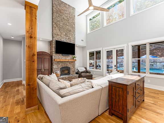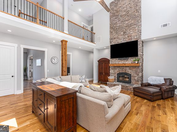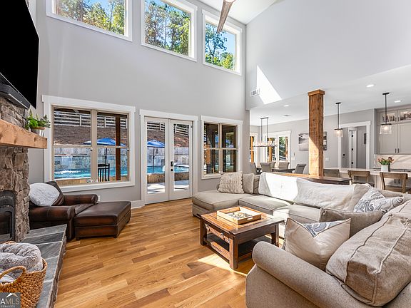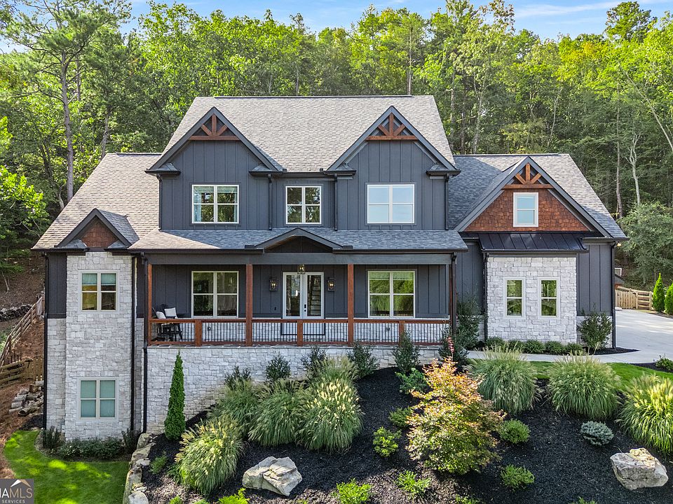 Perched on 1.78 private acres, this 2023 custom-built home brings together thoughtful design and modern luxury in an entertainer's dream setting. The heart of this estate is its outdoor space that boasts a 22,000 gallon heated gunite pool with spa and baja shelf. Covered porches with rocking chairs and overhead fans provide a retreat from the sun, while multiple TVs, soundbars, seating areas and fireplaces create a full entertainment experience. A creek runs along the side of the property, adding a natural soundtrack when it rains, and it's not uncommon to see deer pass through the front yard early in the mornings. From the west-facing front porch, enjoy colorful sunsets that turn each evening into a show of its own. With 4,018 finished square feet above grade and a 2,247 square foot walk-out basement (equipped with high ceilings and bath plumbing ready for completion), this property offers both sophistication and potential. The main floor features a chef's kitchen with black ZLINE appliances, stunning quartz countertops, and a walk-in pantry, opening to a two-story living room filled with natural light. A wood stove anchors the room, offering warmth and charm. Also on the main level: the primary suite with dual closets and a spa-like bath with soaking tub, plus a private office, walk-in laundry, and a guest bedroom with full bath. Upstairs, you'll find three additional ensuite bedrooms, an oversized theatre/bonus room with its own bath, and even a second walk-in laundry room for convenience. And for that extra touch of rustic comfort, knotty white pine wood flooring has been installed throughout the home. While peaceful and private, this property is just minutes from Publix, local schools, and Lake Allatoona. And just 0.3 miles down the road, Qualusi Vineyards offers tasty wine, beer taps, live music, food trucks, and weekend markets - a perfect neighborhood amenity! 161 Blossom Trail is more than a home-it's a retreat.