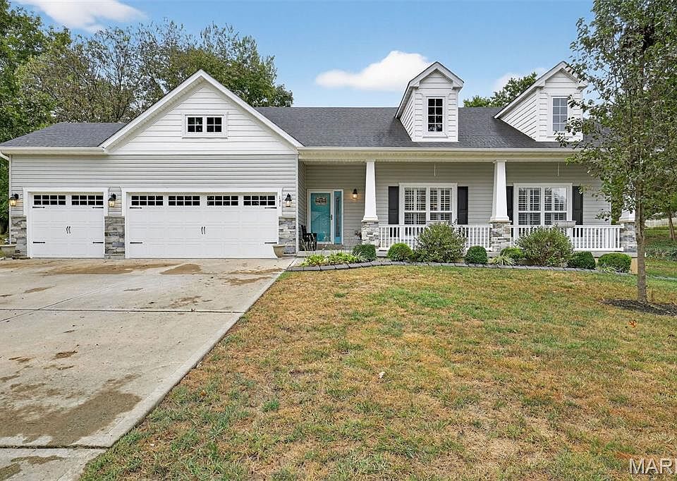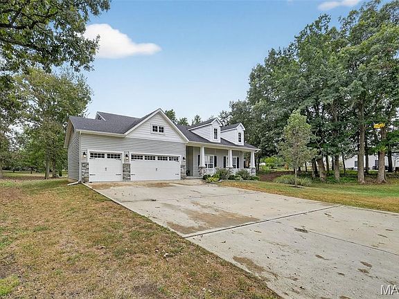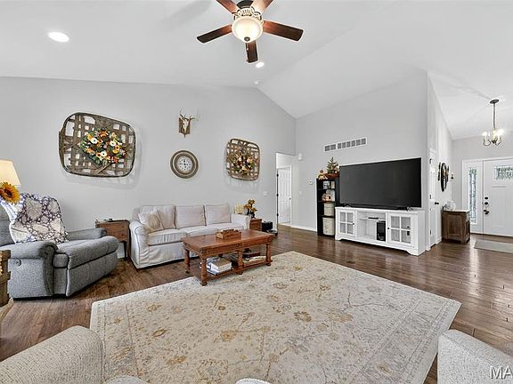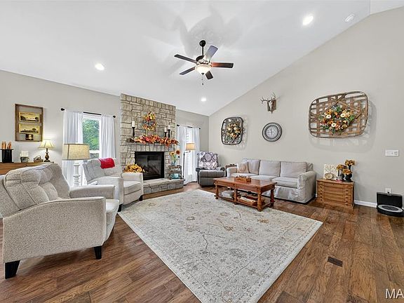 Welcome to this Bluffview Estates home, offering approximately 3,000 square feet of total living space with an open layout. The main level is 1,750 square feet, featuring 3 bedrooms and 2 bathrooms, vaulted ceilings, an open floor plan, a kitchen with an eat-in island, and additional space for a dining table. It also features a gas fireplace, engineered hardwood in the main living area, and an oversized outdoor concrete patio with a fire pit. Kitchen appliances stay. The main level flows perfectly for everyday living or entertaining, making this a very functional house. A three-car garage connects to a laundry room before entering the kitchen. The master bath boasts a full shower and bathtub. Downstairs, the partially finished basement features a living room with a second fireplace, a sleeping area, one full bath, and a sizable storage area. The lower level also includes a surround sound system. The lovely backyard features raised garden beds, space for pets, and outdoor entertainment areas. Excellent location for commuting to Highway 61 for work or all the nearby amenities and Troy R-3 School District.
