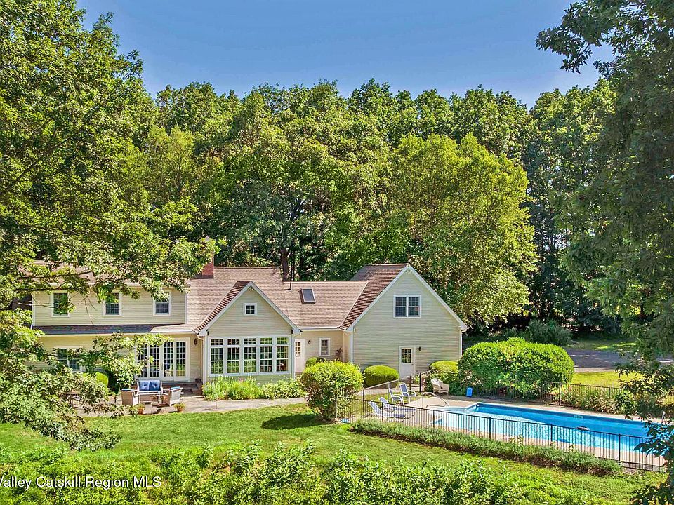 Doors in the living room open to a bluestone terrace that flows to an in-ground pool, surrounded by gardens, designed with care. The grounds include a meadow, stocked pond, and 1,000 feet of trout stream frontage—creating a haven for outdoor enjoyment.