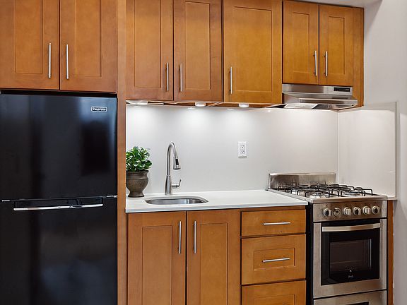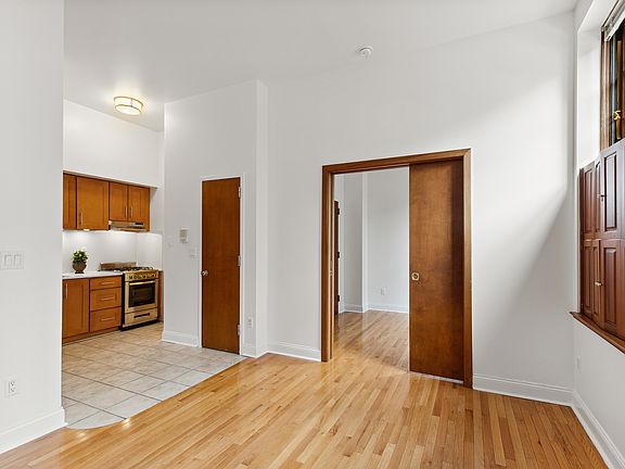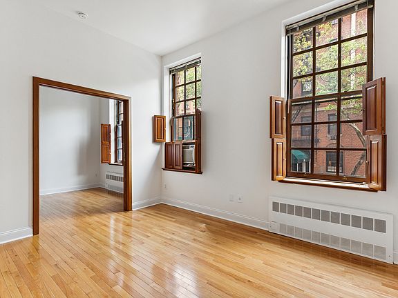 Three flights up, 4F offers fantastic views of Manhattan, and treetops overlooking the peaceful, leafy, townhouse-lined Columbia Heights Street! Hardwood floors and paned windows, create a very inviting and dramatic feel. The living area easily accommodates a living and dining area. The kitchen is separate from the living area, and offers plenty of work space and lots of maple wooden cabinetry, along with a shelved storage closet.