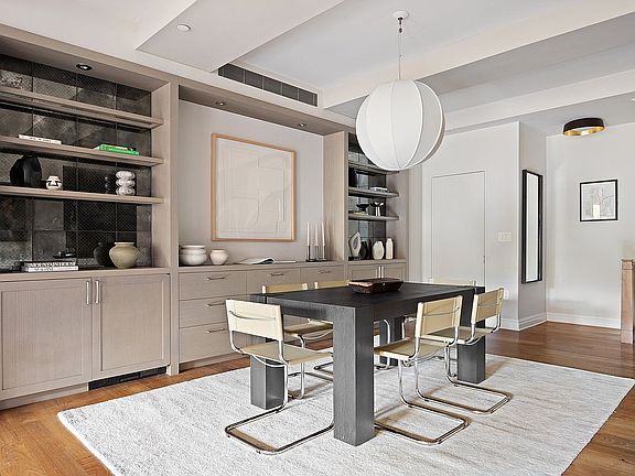 Original architectural details maintain the classic loft character, while modern touches like wide-plank hardwood floors, built-in shelving and cabinetry, and a custom bar add warmth and functionality. A built-in desk creates a dedicated workspace within the great room. The adjacent eat-in kitchen is equipped with custom cabinetry, a vented Wolf range, and integrated appliances for seamless cooking and entertaining.