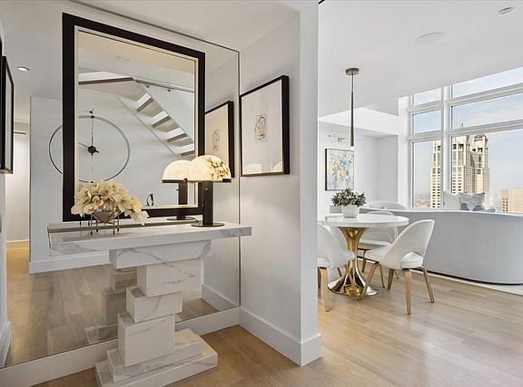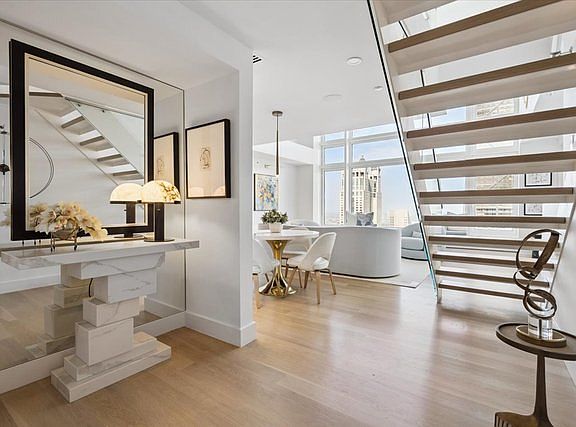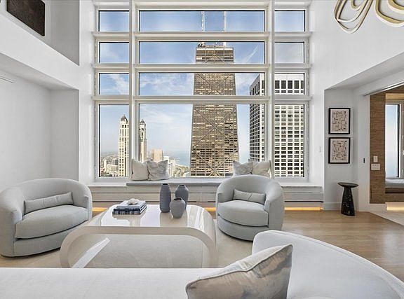 This one of a kind duplex home boasts spectacular views of lake and city on the 58th floor of Olympia Centre. This extraordinary unit is a masterfully redesigned expansive space with 20' soaring living room ceilings, 2 spacious bedrooms, 2.5 baths and magnificent closet space throughout. This 2022 gut rehab consciously reconfigured the space to optimize the exquisite views of the lake and city by installing a see through floating staircase leading to the 2nd floor bedroom with a focus on luxury living both aesthetically and physically. The kitchen and all bathrooms were a custom redesign with the utmost quality finishes. New hardwood flooring and custom millwork add to the elegance of this home. Miele and Sub Zero appliances throughout including an in unit washer/dryer. Beautifully designed stone countertops. Smart home with custom lighting and speakers. Unit 58k2 is a unique home centrally located and walkable to all Michigan Avenue and Oak Street shopping, restaurants and more. Fantastic building staff take care of your every need. Amenities include an indoor swimming pool, two well equipped work out rooms, 24 hour door staff, and on site management. A rare opportunity to own a true Chicago gem in the sky. Seller to settle balance of special assessment at closing. Assigned storage space. Offered furnished.