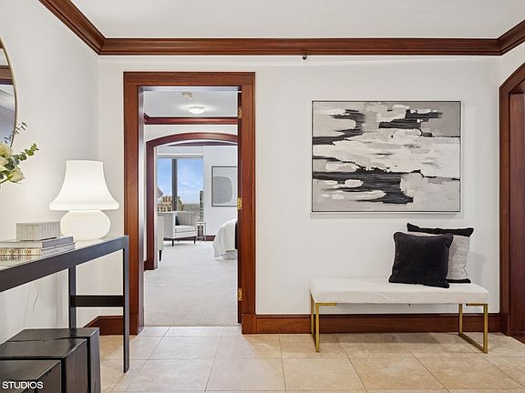 Enjoy this light-filled, spacious two-bedroom, two-bath corner unit in Olympia Centre. Recently home to a beloved Chicago Bear, the residence offers endless Lake and City views to the North, East and West and upgrades throughout the unit. The open living and dining area includes custom millwork for storage and display and connect to a chef's kitchen with Sub-Zero refrigerator, granite counter tops and stainless steel appliances. The large primary suite is an oasis of calm with two walk in closets and spa-like primary bath in marble with large shower, dual vanities and storage. The second bedroom and bath features lake views, a steam shower and additional closets and storage. There's also a wine closet with 100 bottle wine rack built in and external storage space on the same level as the residence. Full-service building with on-site engineer, concierge and doormen. Upscale amenities for you to enjoy include state of the art cardio room, separate weight room, indoor pool, saunas, whirlpool, and breathtaking roof deck and party room. Pet friendly. Convenient and secure parking is available for additional cost.