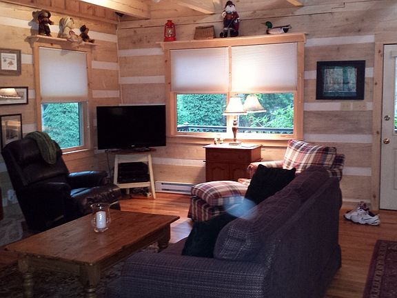 Quintessential Mountain Log Cabin w/ End of lane privacy & fishing pond. So private a setting that you'll feel as if the Catch & Release pond is your own. Bright whitewashed logs of the highest quality foster exceptional light. In the well planned living space you can enjoy a Massive Two Story Stone WOOD BURNING fireplace, large bright windows & wood floors. Open kitchen lends to ease of entertaining. Mountain Woods & pond Views can be enjoyed from every room. Rear of the home sits directly on the private Lakes Community Pond. 2 extended COVERED FULL LENGTH DECKS, both of which offer unobstructed pond views, grace the back of the home & provide pond & trail access. You'll find a bath & bedroom on each of the three floors. Perfect for family or company to have private space to relax & play. The loft sleeping area could serve as family room, game space or sleeping room. Lower fl has 3rd bedroom, 4th sleeping room, game/TV area, Large bath w/ laundry rm & deck. Home comes FULLY FURNISHED just bring a toothbrush. Short Term Rental allowed for income. NATURAL LANDSCAPING. Central Vacuum.