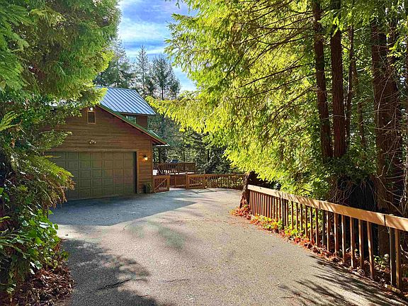 Welcome to 161 National Park Way—a stunning custom-built home nestled among majestic redwood trees, with beautiful views and high-quality finishes throughout. Designed for both style and longevity, the home features cedar siding, a durable metal roof, a tankless water heater, and a whole-home heat pump for efficient heating and cooling. Step outside onto the expansive deck to soak in the serene surroundings, perfect for relaxing or entertaining. Inside, the upper-level primary suite offers a spacious walk-in closet, a versatile library/office, and an updated bathroom with a double vanity, jetted tub, tile shower, and linen storage. Downstairs, you’ll find two additional bedrooms and a full bathroom—ideal for guests or family. The open, light-filled living and dining areas are perfect for gatherings, while the kitchen is a chef's dream, featuring solid wood cabinetry, granite countertops, a copper sink, double ovens, and gas cooktop. The functional laundry room, complete with a wash sink, adds to the convenience. This property is a rare find, offering comfort, elegance, and thoughtful design in a peaceful redwood setting.