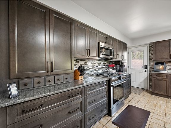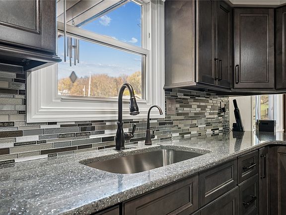 Welcome to this spacious split-entry home with multi-generational living options! The main floor features 3 bedrooms, 2 bathrooms & a stunning Bonura-renovated kitchen with stainless steel appliances, quartz countertops, and elegant finishes. The bathrooms upstairs were designed and installed by Dream Kitchen and Baths. Cozy up by the upstairs fireplace, installed by The Fireplace and Patio Place. Energy Swing windows and doors enhance efficiency and appeal. Downstairs offers an in-law suite with a private entrance, full kitchen, cozy bedroom, and a West Shore handicap-accessible shower. A finished game room with a 1/2 bath adds recreation space. The oversized detached two-car garage and shed offer great storage. Outdoors, enjoy the serene lot with a 51-foot front porch with gorgeous pillars and stamped concrete, a covered back porch, and a cozy firepit. Heater Cap-equipped rear gutters add winter convenience.