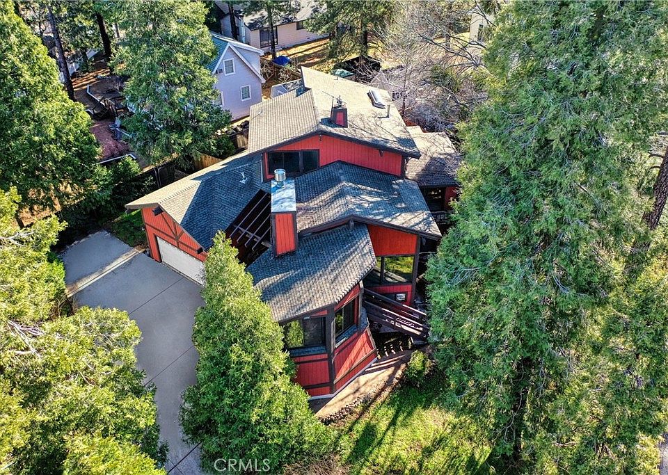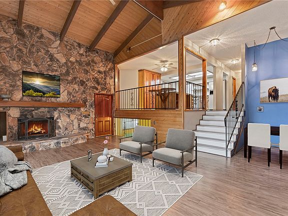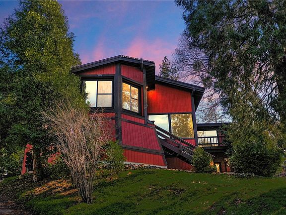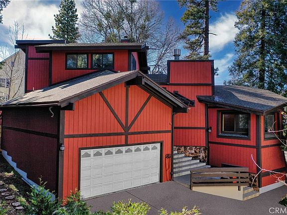 Enchanting Mountain Lodge. Architecturally unique Lodge style Mountain home located on forested lot with plenty of towering pines and mountain views surround this 3900 sq' lodge. Floor-to-ceiling rock fireplace and vaulted wood-beamed ceilings set the mountain -ambiance for the large living room that opens to the kitchen a few steps above. Next to the living room is a family room that would be a great spot as a home office or game room. Kitchen overlooks the living room and features island, breakfast bar and all new custom cabinets. Extra large attached garage leads right into the house for easy winter living. Upper level features the master retreat with fireplace and new bathroom with awesome custom finished shower. Lower level boasts the entertainment wing with spa, bar, deck and theatre room. This home includes central heating, inside laundry, fenced and level yard area plus work shop. This property is located on a paved & maintained road in the desirable "Mile High Park" neighborhood where homes rarely come up for sale and just a few minutes to Lake Gregory. The lake features some great fishing, walking trail and marina to rent fishing boats, paddle boards and kayaks.