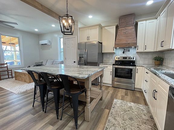 Stunning BRAND-NEW modern farmhouse located in the quaint lakefront neighborhood of Oak Hill, just off the main channel of Kerr Lake. This home was built by true craftsmen with meticulous attention to detail, which shines throughout the entire property both. Boasting Board & Batten siding, custom oversized gutters, standing seam metal roof, main floor covered deck, lower-level patio, firepit area, circle drive and just enough mature trees for your own privacy you will begin to fall in love before you ever get out of the car! Inside this home you are met with a carefully thought out open concept floorplan, with 3 bedrooms, 3.5 baths, over 2000 square feet of living space on 3 levels, a custom kitchen with white solid wood shaker design cabinetry, an island & hood range handcrafted by a local artisan, hand cut Italian tile back splash, granite countertops, 9ft ceilings, a Primary ensuite with an oversized tile shower & expansive walk in closet, all illuminated by the natural lighting from the 6 foot tall windows and lake views in almost every room. The location of this home on its interior lot optimizes lake views, privacy, and provides easy lake access.