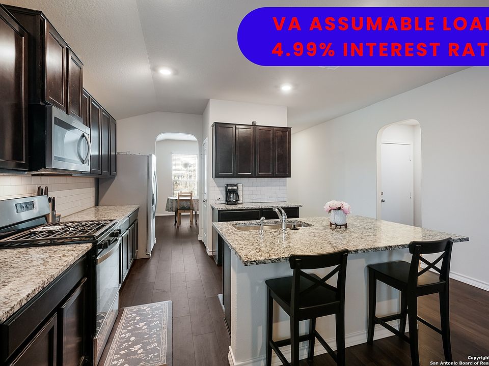 Unbeatable Opportunity: VA Loan Assumable at 4.99! Stop paying today's high interest rates! This modern, single-story home in Redbird Ranch offers an exceptional financial advantage: a 4.99 VA loan that is assumable by a qualified veteran buyer (subject to VA and lender requirements). Secure an unprecedented low payment and save thousands over the life of the loan. Welcome home to a bright, open-concept design featuring soaring high ceilings and an intelligent layout built for modern living. The gourmet kitchen is the heart of the home, boasting rich dark brown cabinetry, a massive eat-in island, matching appliances, and seamless flow into the main living area. Retreat to the spacious primary bedroom, featuring an oversized walk-in closet and a luxurious primary bath complete with a double vanity, separate shower, and a soaking tub. Includes a separate dining area with an archway entry, utility room inside, and durable flooring with low-maintenance ceramic tile and soft carpeting. Entertain effortlessly on the covered back patio overlooking a large, private, fenced backyard-perfect for pets, play, and Texas BBQs. The home also features a full sprinkler system and mature trees. Take advantage of the resort-style community amenities, including a pool, clubhouse, fitness center, tennis and sports courts, playground, and scenic trails.Located in the desirable Redbird Ranch subdivision with quick access to Loop 1604, extensive shopping, dining, and military bases.