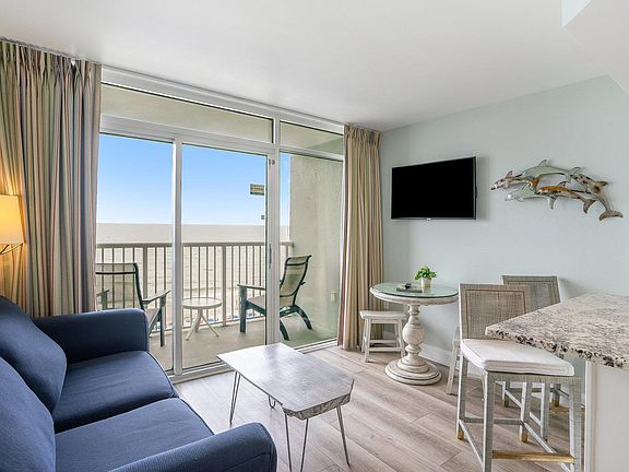 This is a beautifully maintained, fully furnished 1-bedroom, 1-bathroom condo in the highly sought-after Sea Watch Resort. Enjoy breathtaking views of the Atlantic Ocean and the pool deck from the private balcony. This spacious unit features elegant décor, durable LVP flooring throughout, and a well-appointed kitchen with granite countertops, ample counter space, and modern appliances. The bathroom is stylish and inviting, making this condo ideal as a serene vacation getaway, a smart investment opportunity, or even a comfortable year-round residence. Sea Watch Resort offers a prime oceanfront location just steps from the beach and boasts incredible amenities including five outdoor pools, two indoor pools, 12 hot tubs, a lazy river, an onsite restaurant and café, and a fully equipped fitness center. The building is elevator-accessible for added convenience.