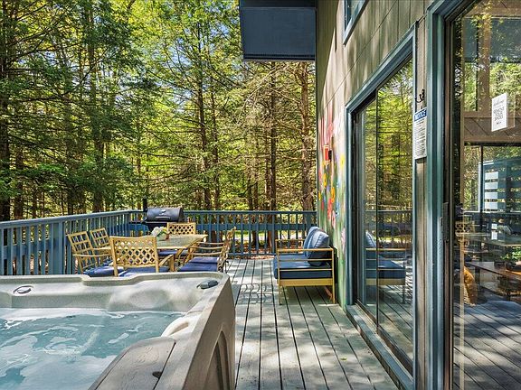 Welcome to Poconos Wildflower, a stunning retreat tucked inside the sought-after Camelot Forest community. This beautifully updated 3-bedroom, 2-bath home offers just under 2,000 square feet of sun-filled living space, with soaring windows and sliding glass doors that highlight a cozy living room fireplace. Step outside to an expansive deck featuring a private hot tub surrounded by peaceful wooded views—perfect for entertaining or relaxing in all seasons. Located just minutes from Jack Frost and Big Boulder ski areas, Kalahari Resort, Mount Airy Casino, and The Crossings Outlets, this property offers convenience to the very best of the Poconos. Whether you're seeking a full-time residence, a weekend escape, or a short-term rental investment, this home is move-in ready and STR-friendly with low HOA dues and easy access to community lakes and trails.
