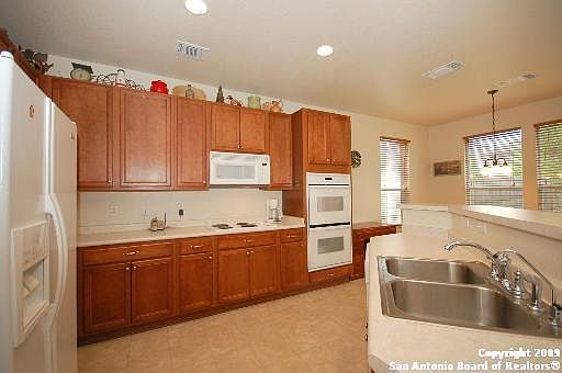 Beautiful open floor with extra office & study. Kitchen has double ovens, built in microwave, lots of tall cabinets. Custom built 12x12 storage shed with electric is awesome! Great Master Suite & bath with dual vanities, separate tub/shower. This home has too many features to name here. You will be convenient to RAFB, Fort Sam Houston, IH35, & Shopping at your finger tips