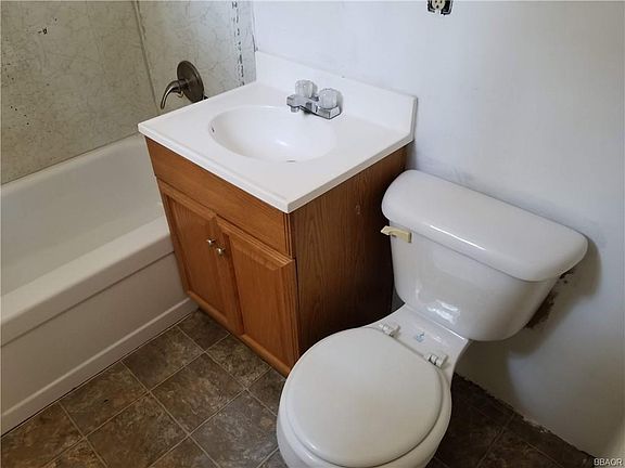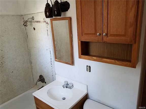 Chalet style cabin sitting on a level lot needs TLC. Vaulted T&G ceilings give this home a rustic vibe. Kitchen cabinets are in good shape and there is hook ups for a stack washer dryer. Wood burning stove in living room for chilly days. One bedroom downstairs and loft upstairs. Storage shed in the back yard and yard is fenced. Walking distance to Sugarloaf Park and Big Bear Skatepark.