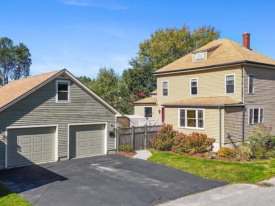 The moment you walk through the entry gate, and step onto the patio you will be impressed with this property. Enter the main house to find an open concept with white kitchen offering granite counter tops, stainless appliances, dining area, living room with pellet stove and French doors to the deck, huge laundry/mud room with utility sink and cabinetry, as well as a full bath. Upstairs are three bedrooms plus a large second full bath with custom walk-in shower. The house features wood and tile floors. An oversized 2-bay garage could accommodate up to four cars or large workshop area with more living space above with half bath, ideal for home office, guest suite, or possible accessory dwelling unit. The extra-large-fenced-in back yard offers ample space with shed for gardening, pets or play area. Excellent Ferry Village neighborhood close to the Green Belt Trail, Willard Beach and Mill Creek areas and just minutes to downtown Portland.