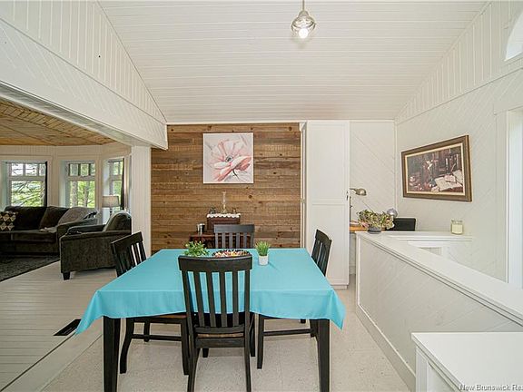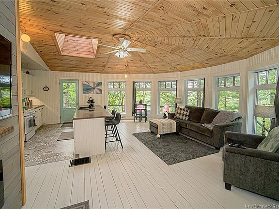 Tucked away this beautiful bungalow blends privacy, comfort, style offering a bright inviting layout with thoughtful design throughout. The open-concept layout features a dining area flowing into the kitchen living room. A striking curved wall of windows showcases serene views of the private backyard. The kitchen includes an island with seating, skylight and direct access to the expansive deck—perfect for gatherings and enjoying the view, with glimpses of the Miramichi. The living room is enhanced by a striking curved wood ceiling, adding warmth and architectural charm.The bathroom is generously sized, both a shower and a soaking tub and skylight. A bedroom perfect for family or guests, while the primary suite offers plenty of space and large closet. The mudroom, with excellent storage and a convenient laundry area, leads straight to the oversized double garage—offering room for cars and all your essentials. The lower level offers storage and includes a room that could serve as a bedroom (currently non-conforming). Close to local amenities and nearby NB Trail, this property combines privacy, comfort, and convenience in a desirable setting. From the backyard, a sloping incline leads to the River, perfect for enjoying the natural surroundings. Unpack and enjoy the stunning views! All measurments are approx & to be confirmed by purchaser.