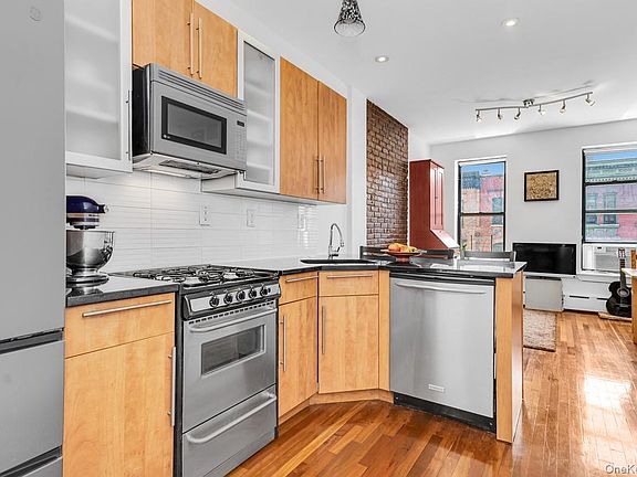 Its layout provides a south facing living room, windowed kitchen, windowed bathroom, additional office space, an east view second bedroom and a north view primary bedroom. This home includes a washer/dryer, dishwasher, granite countertops and hardwood floors. The primary bedroom can host as large as a king size bed. Nestled next to a Community Garden and conveniently located between the 2/3 Express and B/C trains, this is a perfect opportunity for anyone seeking to own their very first two bedroom home.