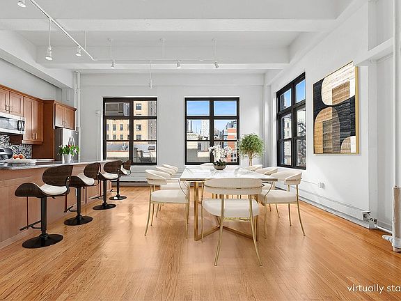 This authentic New York City loft offers soaring ceilings, a dramatic open layout, and expansive North/East skyline views that capture the essence of downtown living. The renovated open-island kitchen features modern finishes, premium appliances, and generous counter space-ideal for both everyday living and entertaining. The spa-style marble bath includes a Jacuzzi tub and glass-enclosed shower. A spacious sleeping area, massive walk-in closet, and in-unit washer/dryer provide exceptional comfort and convenience.