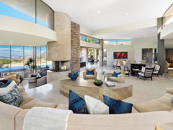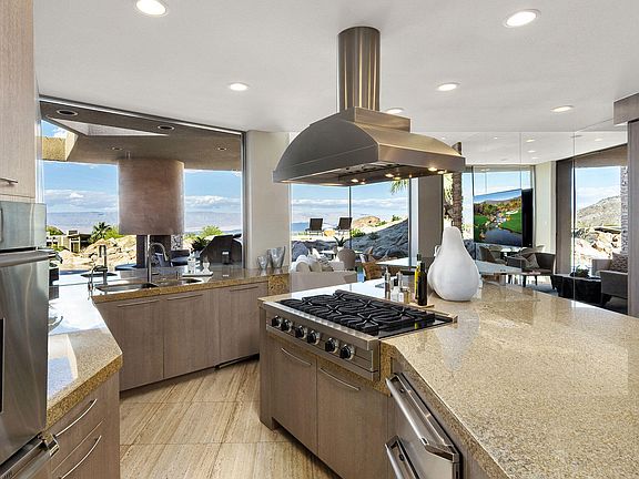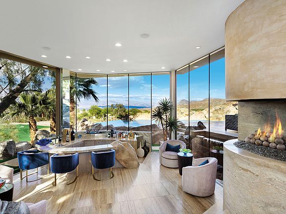 This Timeless contemporary home is tucked above the 2nd green of BIGHORN'S Mountain course, offering dramatic down-valley views. Created by architectural designer Guy Dreier, this residence includes four generous suites plus a media room with bar, and a fifth suite currently being used as an office/study. Pocketing walls of glass open to create indoor/outdoor living with the great room, kitchen and family rooms. The dramatic 'lounge bar' is the perfect place to entertain, with soft seating, fireplace views of the valley and golf course. The master retreat offers high ceilings and access to the private patio and spa. The master bath includes two vanities, two lavs, two large walk-in closets, sunken tub, oversized glass shower with direct access outside to the outdoor shower and spa. Stunning setting. Offered furnished.