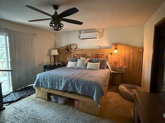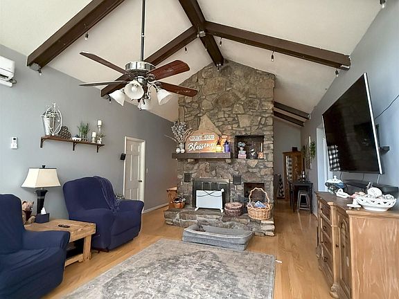 Cozy rock fireplaceSpacious bedroomsScenic tree-filled lotVaulted beamed ceiling